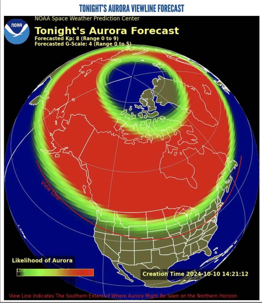 According to NOAA’s Space Weather Prediction Center, the Ovation Model uses two maps to show the North and South poles of Earth respectively. The brightness and location of the aurora is typically shown as a green oval centered on Earth’s magnetic pole. The green ovals turn red when the aurora is forecasted to be more intense. The sunlit side of Earth is indicated by the lighter blue of the ocean and the lighter color of the continents.