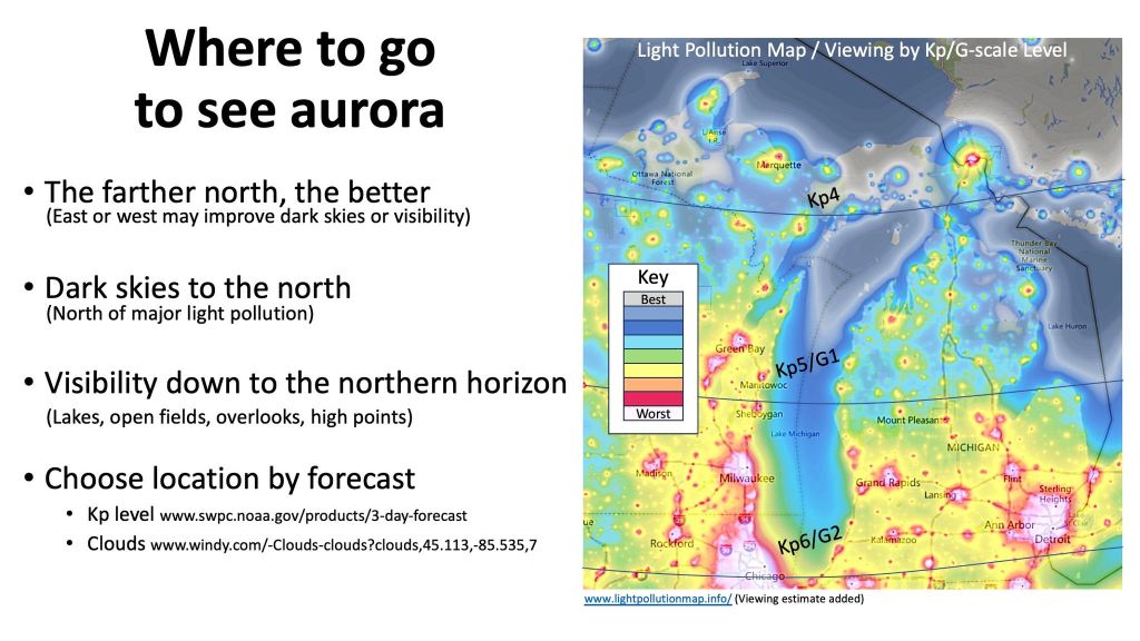 - During G2 Storm levels (equivalent to Kp6 or K6), any location in the state of Michigan with clear and dark skies could work.